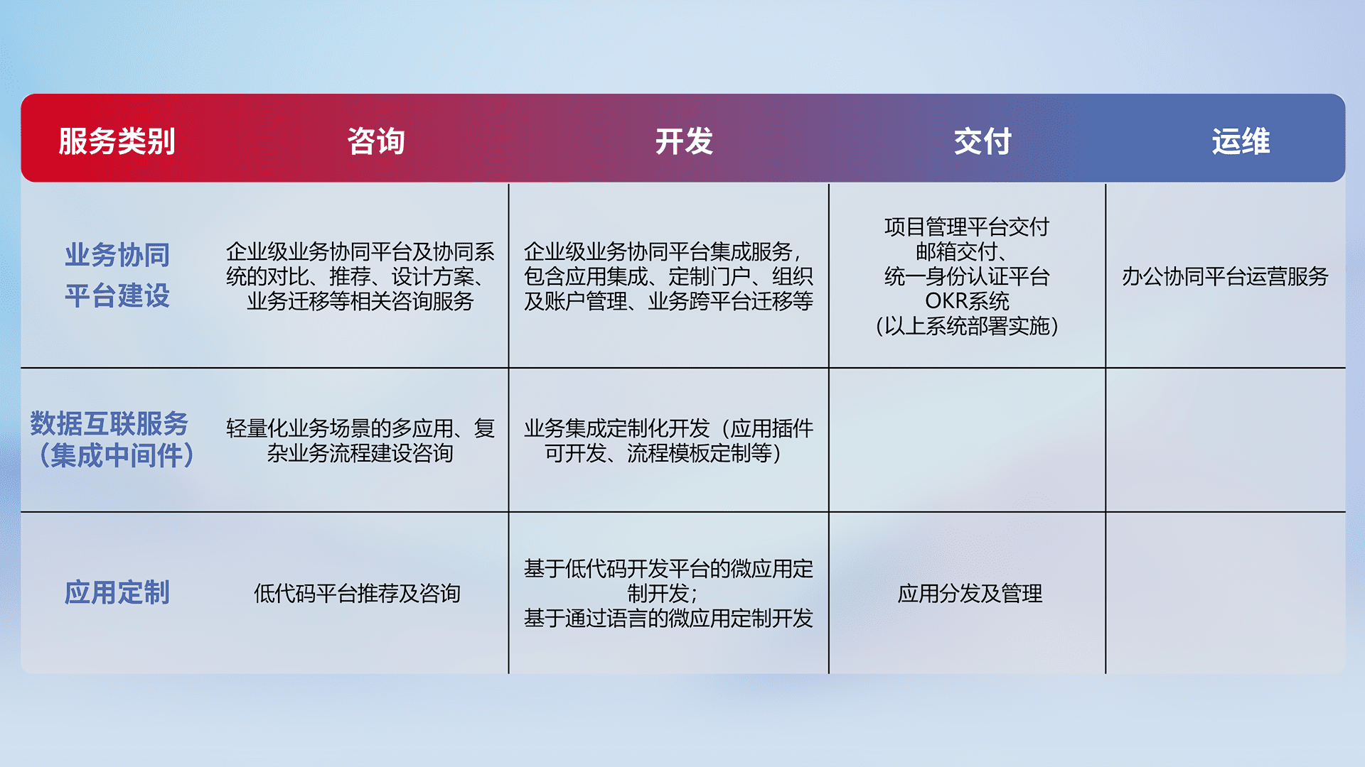 针对钉钉、、、、企微、、IDaas等平台级产品提供产品的规划、、方案、、、、交付、、定制化开发等服务,,,实现如统一协同办公、、、智能客户服务、、、混合会议管理、、、智能数据查询、、、等业务场景,,实现数字化转型。。